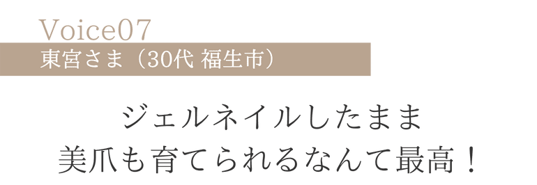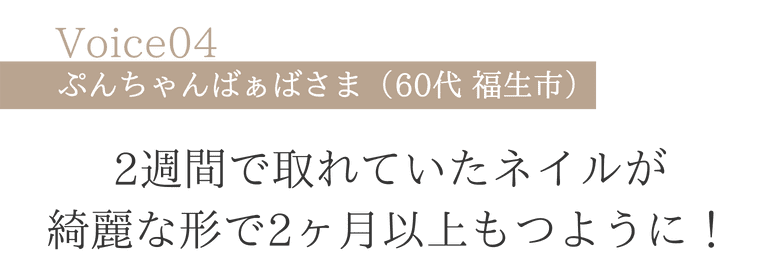 ピリナさんと出会い、早半年が経とうとしてますが、何より毎回長持ちして途中ではがれることなく、自爪のピンクの部分ごと縦長に伸び、爪の形も見違えるほど綺麗になりました!
