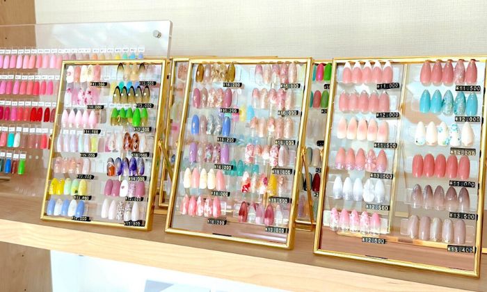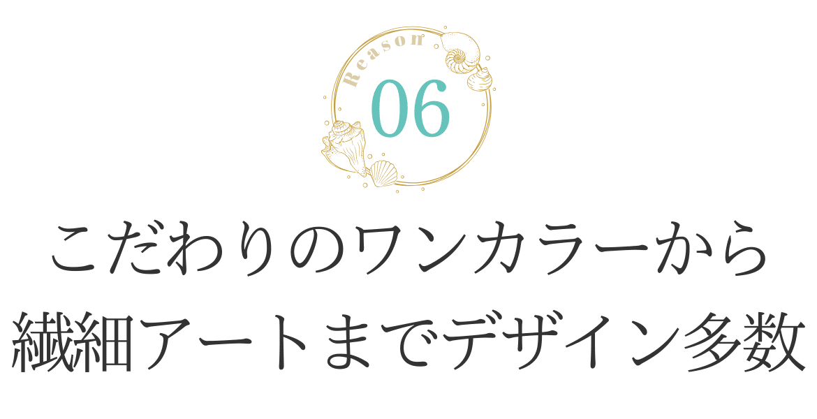 当サロンは、ぷるんとした艶々の極上ワンカラーをはじめ、ナチュラルで清楚な印象のオフィスネイル、1本1本手描きの芸術的なアートネイルまで、様々なテイストのデザインをご用意しています。