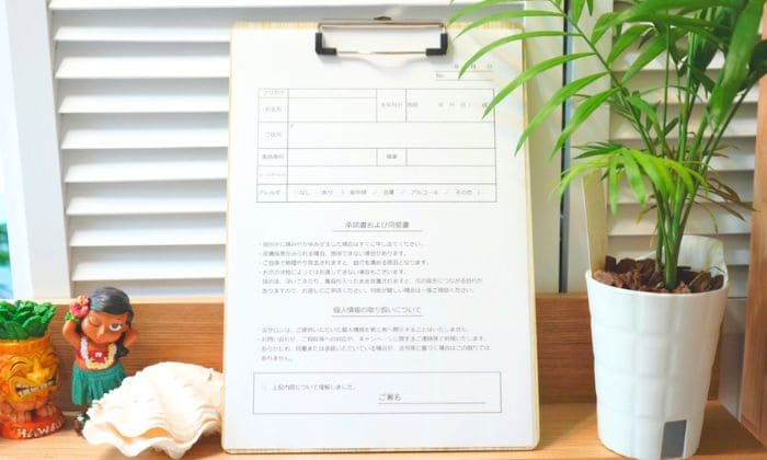 簡単なカウンセリングシートをご記入いただき、ご自身が抱えている爪へのコンプレックスや過去のトラブル、現在のお悩みなどをお伺いいたします。